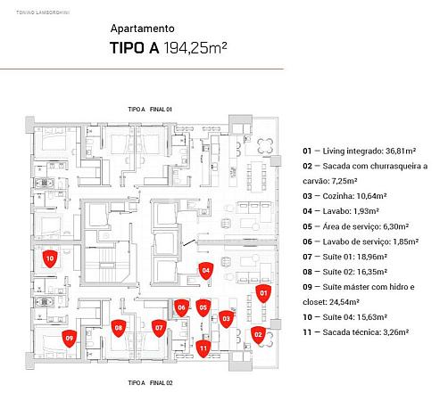 O empreendimento Tonino Lamborghini possui o que há de mais sofisticado em desing italiano e conta com ambientes exclusivos. Serão 04 suítes, sendo uma suíte master com hidromassagem e closet, living integrado com cozinha gourmet, sacada com churrasqueira à carvão, vagas de garagem pra 03 carros e magnífica área de lazer para você e sua família!